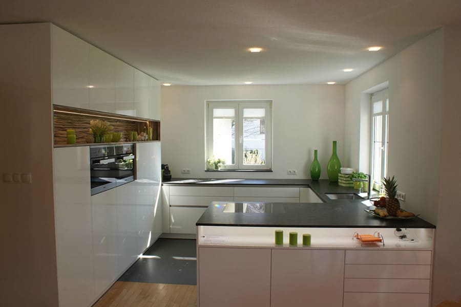 G shaped kitchen make use of every inch of space to make the room spacious. Added peninsula gives it a perfect G shape to your kitchen. Cooking area is covered by three walls of cabinets. Giving a more inviting look that holds appliance and make extra room for storage. It is most efficient type of kitchen that has all the things great kitchens have. Ample of countertops and storage space for cooking and preparing meal makes it more lovable modular kitchen.